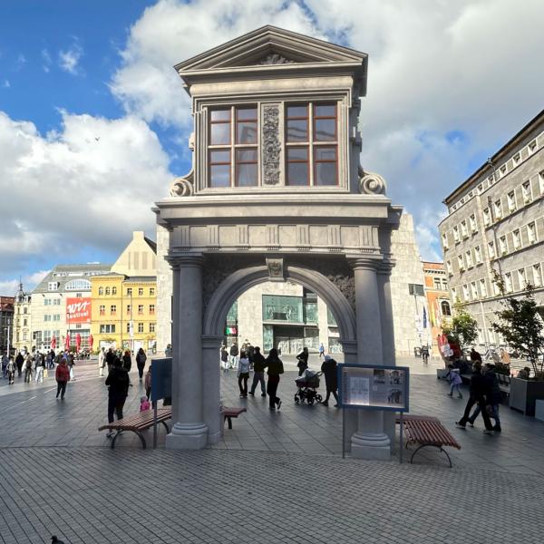 Zum Abschluss der Serie von Visualisierungen des 9,88 m hohen, 4,85 m breiten und mind. 1,32 m tiefen Barockflügel-Portals aus verschiedenen Perspektiven zeigen wir nochmals die Vorderseite von Süden (Kaufhaus New Yorker), heute jedoch am Tag. Beim Anklicken des Bildes ist dieses Mal der Rote Turm zu sehen .