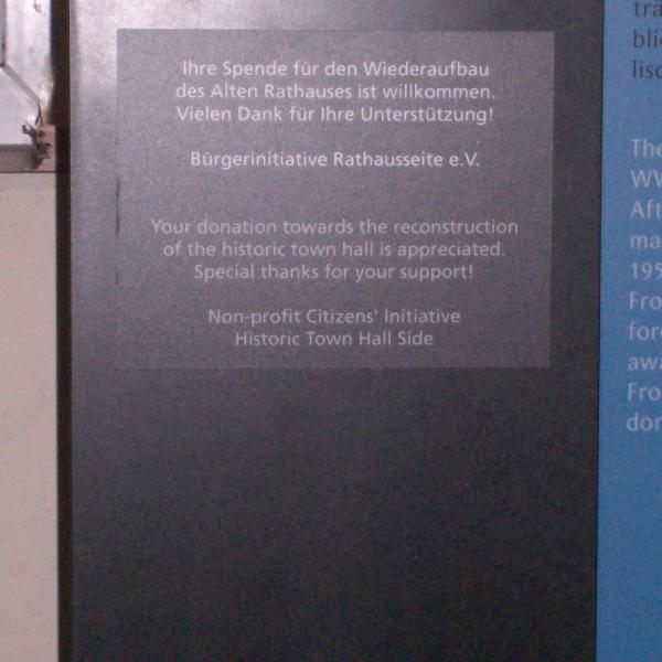 Heute wurde ein weiteres Spendenkonto für den Wiederaufbau des Alten Rathauses eröffnet. Das Konto führt die Volksbank Halle (Saale) eG: BLZ 800 93 784 - Konto-Nr. 111 40 50 - Verwendungszweck: Altes Rathaus. - Den nächsten Infostand am Ratshof betreuen wir am Sonnabend, dem 10. Juli 2010, von 11 - 17 Uhr.
