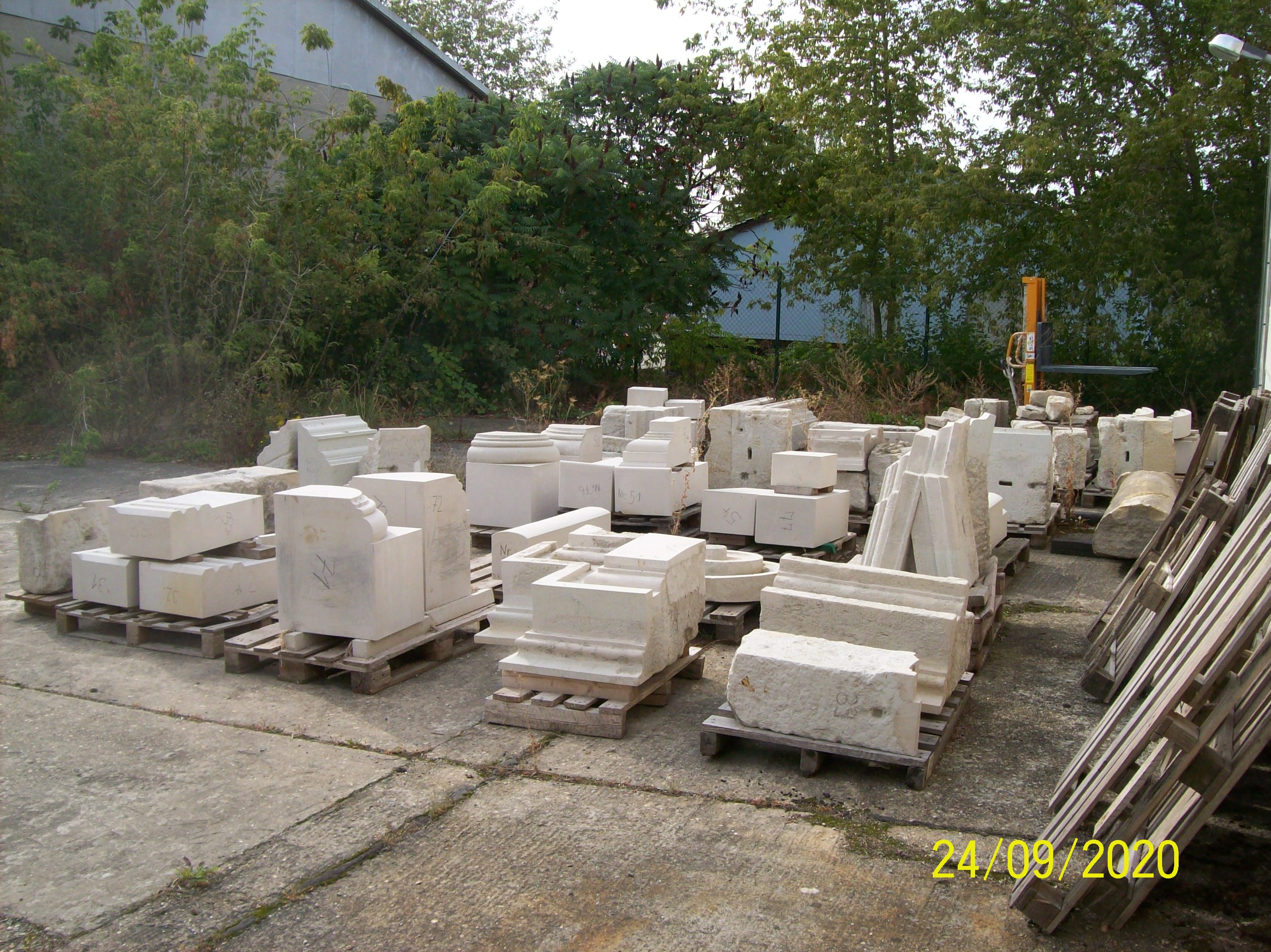 Foto (BI): Ein Großteil restaurierter und nachgebildeter Portalsteine vor dem Transport in die Lagerhalle