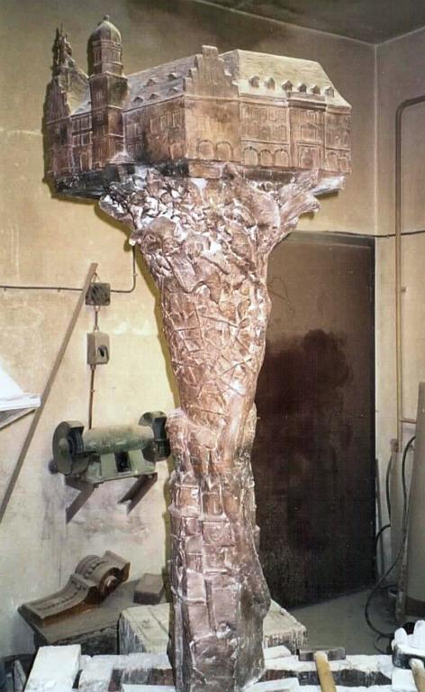 Wäre die Bronzeplastik des Alten Rathauses eine Person, würde sie heute "erwachsen". Das nun "volljährige" Kunstwerk, vom Kuratorium Altes Rathaus Halle (Saale) e.V. in Auftrag gegeben und von Burgabsolventin Cathleen Meier gestaltet, wurde am 28.10.2001 feierlich eingeweiht. Das Foto zeigt die Plastik noch in der Werkstatt.