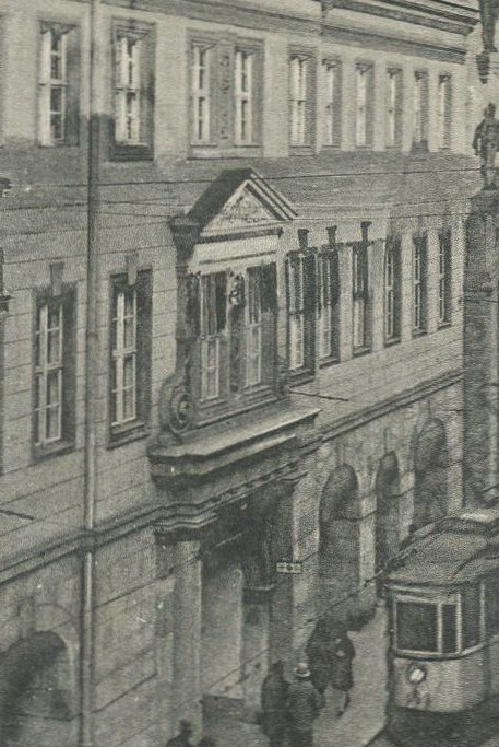 Abbildung: Barockflügel(-Portal) des Alten Rathauses in der Leipziger Straße mit Straßenbahn (Sammlung J. Hauke)
