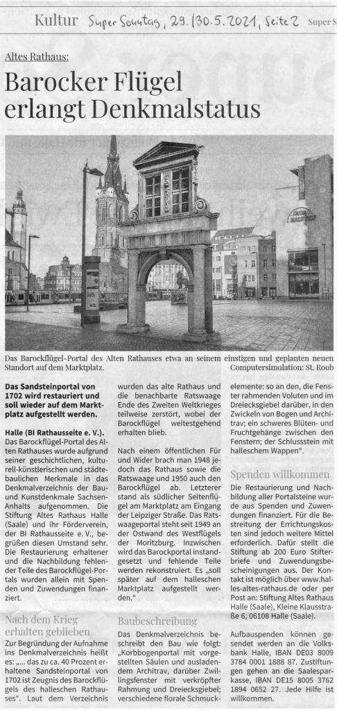 Altes Rathaus: Barocker Flügel erlangt Denkmalstatus, SuperSonntag, Halle & Umland, 29.-30.5. 2021, Seite 2 - Das Sandsteinportal von 1702 wird restauriert und soll wieder auf dem Marktplatz aufgestellt werden. Das Barockflügel-Portal des Alten Rathauses wurde aufgrund seiner geschichtlichen, kulturell-künstlerischen und städtebaulichen Merkmale in das Denkmalverzeichnis der Bau- und Kunstdenkmale Sachsen-Anhalts aufgenommen.