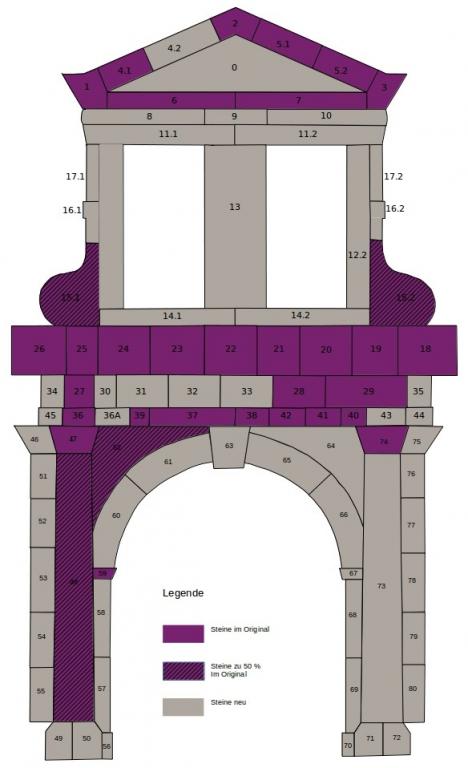 Nebenstehende Abbildung zeigt, welche Steine des Barockflügel-Portals des Alten Rathauses zumindest teilweise im Original vorhanden sind (lila). Die fehlenden und somit vollständig nachzubildenden Portalsteine sind grau dargestellt. Das Infoblatt 7-2018 enthält eine Übersicht über die bis dahin vergebenen Portalsteine. Inzwischen gibt es Steinpaten auch für die Steine 39, 41, 51, 57, 58, 76 und 77.