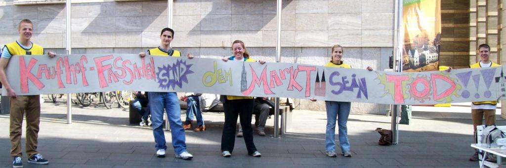 Foto: Ein Arbeitsergebnis unseres Projekts zum 9. Freiwilligentag. 5 junge Leute malten das Spruchband "Kaufhof-Fassaden sind dem Markt sein Tod" (in Anlehnung an Sebastian Sicks Erfolgsbuch "Der Dativ ist dem Genitiv sein Tod"). Das Spruchband wird im Mai 2014 zum 10. Jahrestag der Eröffnung des Kaufhof-Erweiterungsbaus auf dem Grundstück der Ratswaage wieder auf dem Marktplatz zu sehen sein.