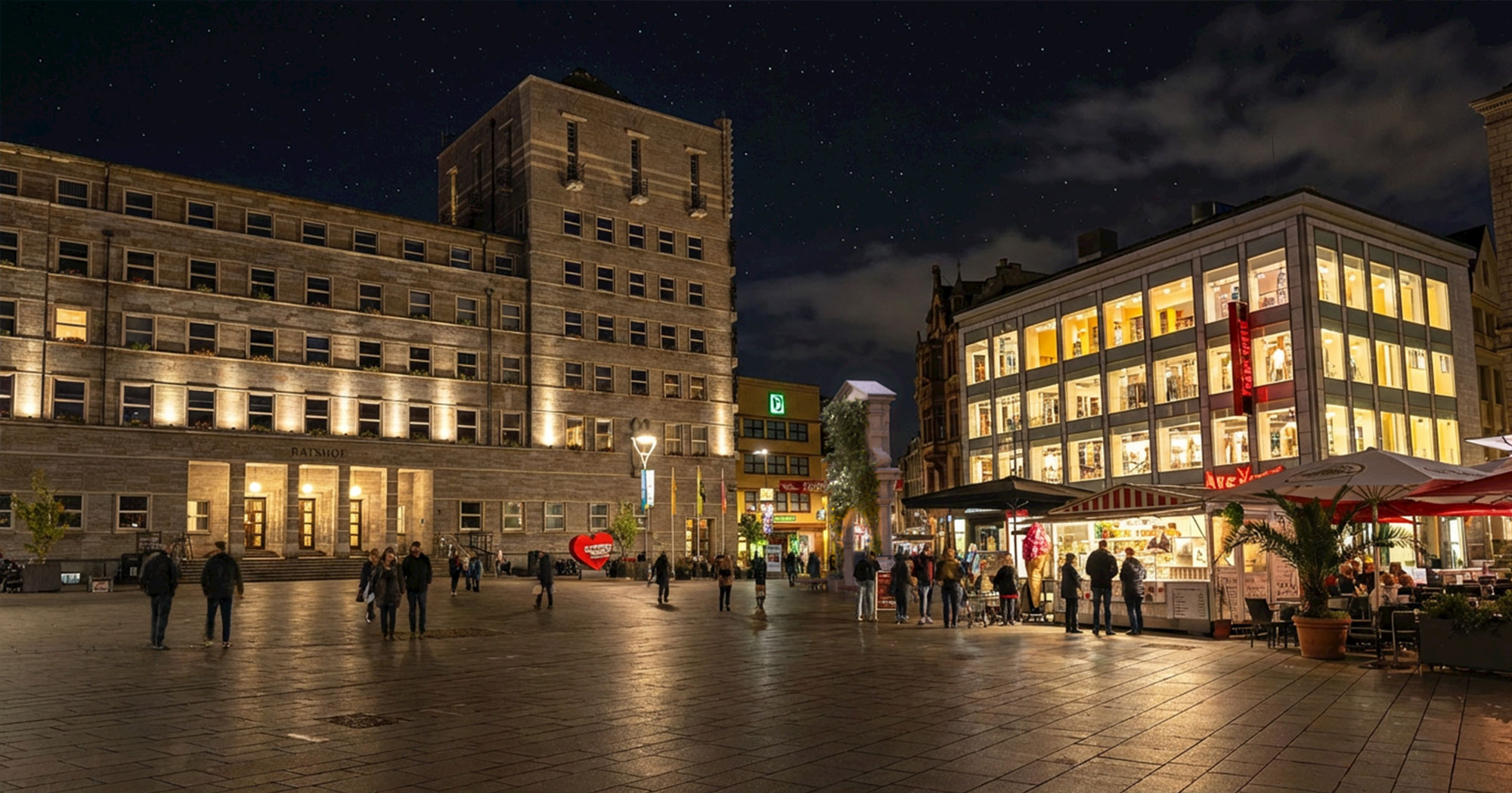 Die Ostseite (Rathausseite) des Marktplatzes wirkt ohne das bis 1950 abgetragene Alte Rathaus recht öde. Es dominieren das Hinterhaus des Alten Rathauses (Ratshof) und der Kaufhaus-Klotz auf dem Ratswaage-Grundstück. Das beleuchtete Barockflügel-Portal würde nach seiner Wiedererrichtung am authentischen Standort auch abends von diesen nüchternen Bauten ein wenig ablenken und zur angenehmen Belebung dieses Teils des Marktplatzes beitragen.
