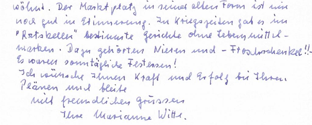 Wir werden sie in dankbarer Erinnerung behalten. - Abbildung: Auszug aus einem Dankesschreiben von Frau Dr. Witte an die BI Rathausseite e.V., 5.1.2010 (Vergrößerung möglich über die Suchfunktion. Eingabe: Dr. Witte -> Klick auf erste Abbildung oder Autograph)