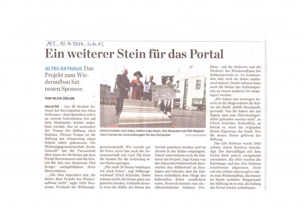 In der "Mitteldeutschen Zeitung" vom 12.4.2019 veröffentlichte Silvia Zöller den Artikel "Ein weiterer Stein für das Portal" (Seite 12). Anlass war die Übergabe des Stifterbriefes für den Portalstein Nr. 46 durch ein Mitglied der Salzwirkerbrüderschaft an den Vorstand der Halleschen Wohnungsgenossenschaft FREIHEIT eG.