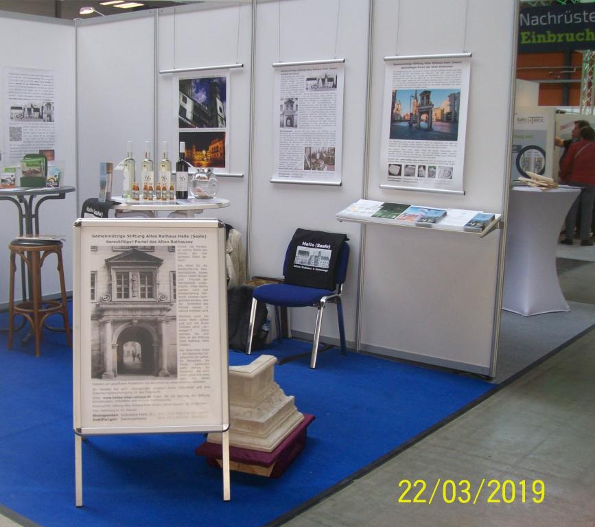 Abbildung: Unser Stand in Halle 4 mit einem der beiden Kämpfersteine des Barockflügel-Portals des Alten Rathauses