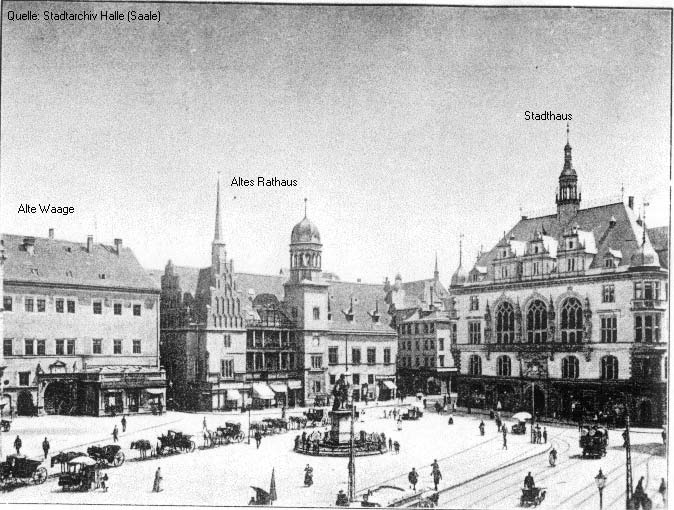 Abbildung: Alte Waage (links), Altes Rathaus (mittig), Stadthaus (rechts) um 1900 (BI-Archiv)