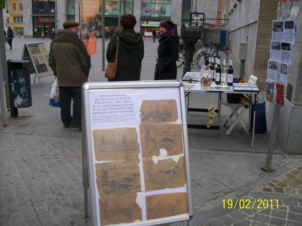 Abbildung: Aufsteller am Infostand der BI Rathausseite e.V. mit den Rathaus-Entwürfen von E. Schmidt