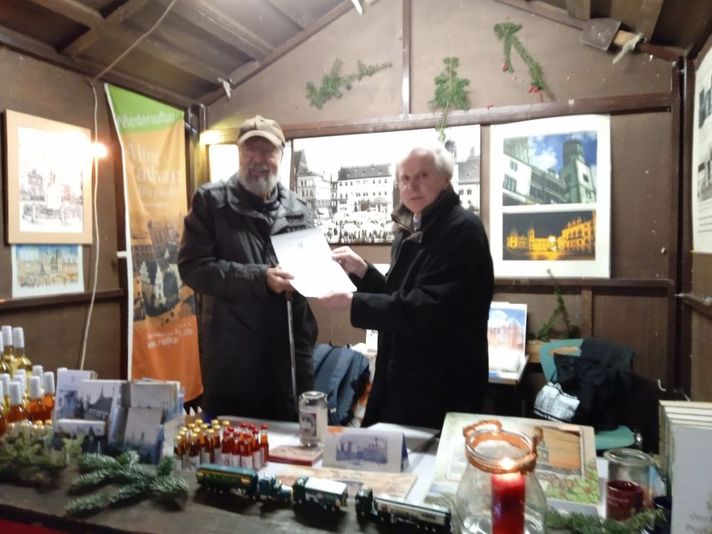 Gestern beendete der Förderverein der Stiftung Altes Rathaus Halle (Saale) seine fünftägige Präsenz auf dem Weihnachtsmarkt. Die BI Rathausseite e.V. freut sich über Bruttoeinnahmen von insgesamt 1.195,25 Euro für das Barockflügel-Portal des Alten Rathauses. Am letzten Tag konnte der Vorstandsvorsitzende der Stiftung in der Vereinshütte am Roten Turm zusätzlich noch einen weiteren Stifterbrief über 600,- Euro überreichen (siehe Foto).