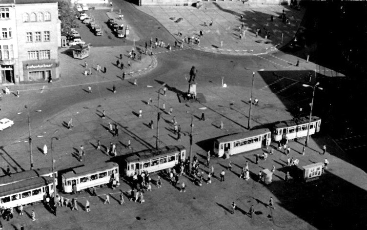 Foto (U. Schröder): Die Rathausseite des Marktplatzes oben im Bild in den 1960er Jahren - eine Freifläche nach der Beseitigung der Ratswaage, die links oben (Parkplatz) stand, und des Alten Rathauses, das sich vor dem Ratshof befand, zwischen 1948 und 1950.