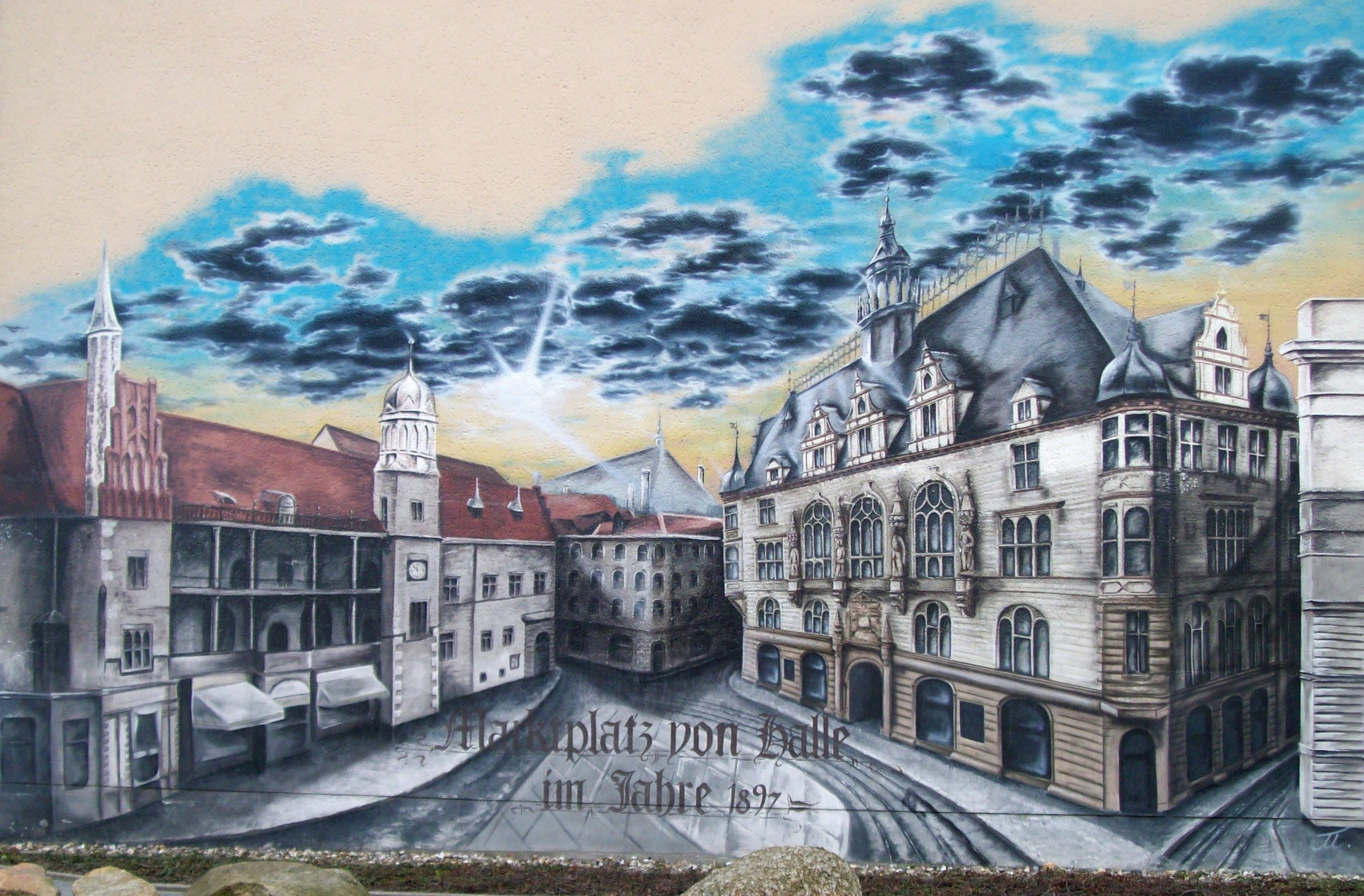 Abbildung: Giebelbild in der Merseburger Straße 414. Altes Rathaus links, Stadthaus rechts. (Foto: U. Schröder)