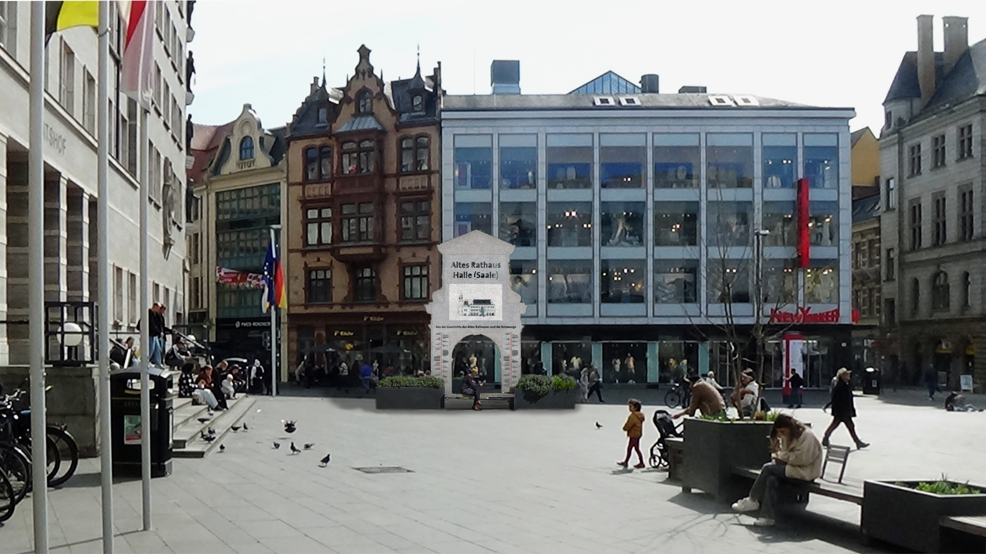 In der Vereinshütte informieren wir am 7. und 8. Juni zwischen 12 und 18 Uhr über die öffentlichen Sitzungen der beiden Ausschüsse. Das Ergebnis der Abstimmung akzeptieren wir, lassen uns jedoch nicht entmutigen, mit sachlichen Argumenten weiter für die Errichtung des denkmalgeschützten Portals am Originalstandort zu werben. - Abbildung: Vorschlag zur Gestaltung der Portalrückseite (Stadtmarketing Halle (Saale) GmbH)