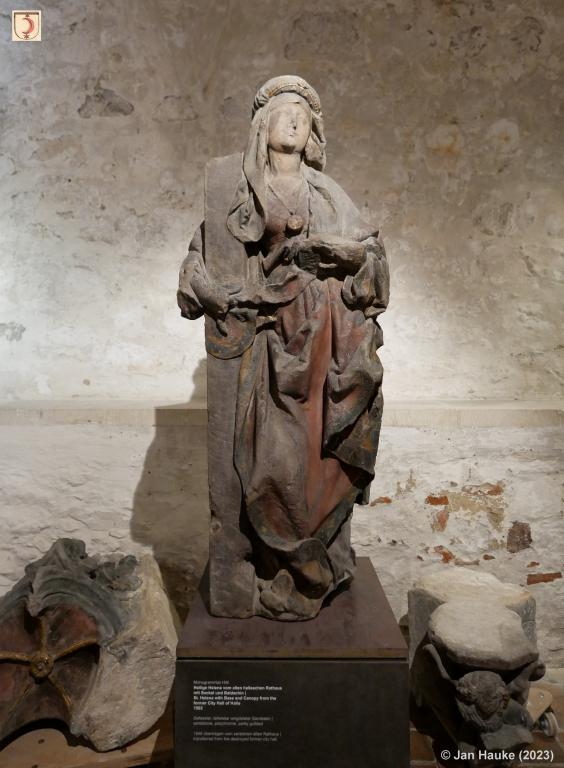Von Halles Altem Rathaus ist mehr Originalsubstanz erhalten, als manche vermuten. Neben den Grundmauern und ca. 40 Prozent erhaltenen Steinen des Barockflügel-Portals existiert u. a. auch die Heilige Helena noch (siehe Foto von Jan Hauke). Diese Sandsteinskulptur eines der bedeutendsten Meister der deutschen Frührenaissance (bekannt als H. W.) zierte seit 1502 die Nordwestecke des Alten Rathauses (Ratskapelle). Heute kann das Kunstwerk in der Moritzburg besichtigt werden.