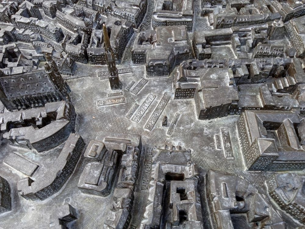Abbildung: Das Innenstadt-Modell am Roten Turm. Auch der Blick von Süden auf den Marktplatz veranschaulicht deutlich die durch den Abriss des Alten Rathauses erzeugte Baulücke vor dem Ratshof und den dadurch nach Südosten ausufernden Platz. (Foto: U. Schröder)