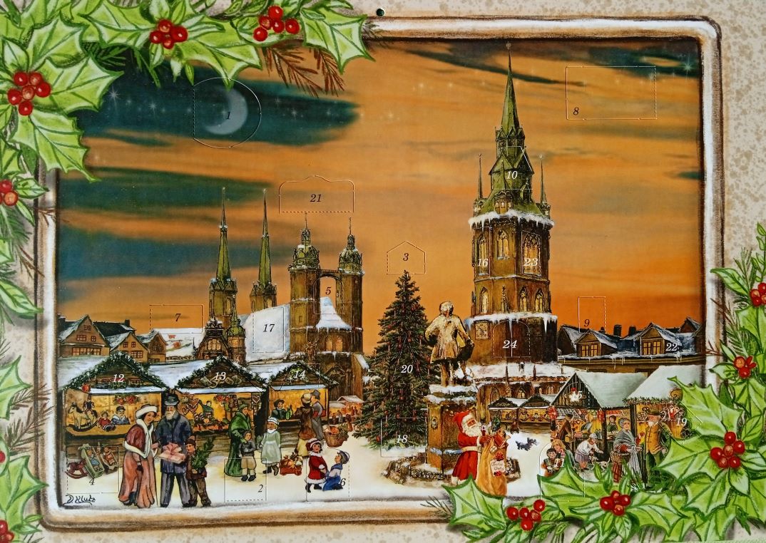 Hier erhalten Sie u. a. wieder Adventskalender mit Halle-Motiven des halleschen Künstlers D. Klutz für 12 Euro/Stück. Im Foto ist eines der vier Motive zu sehen.