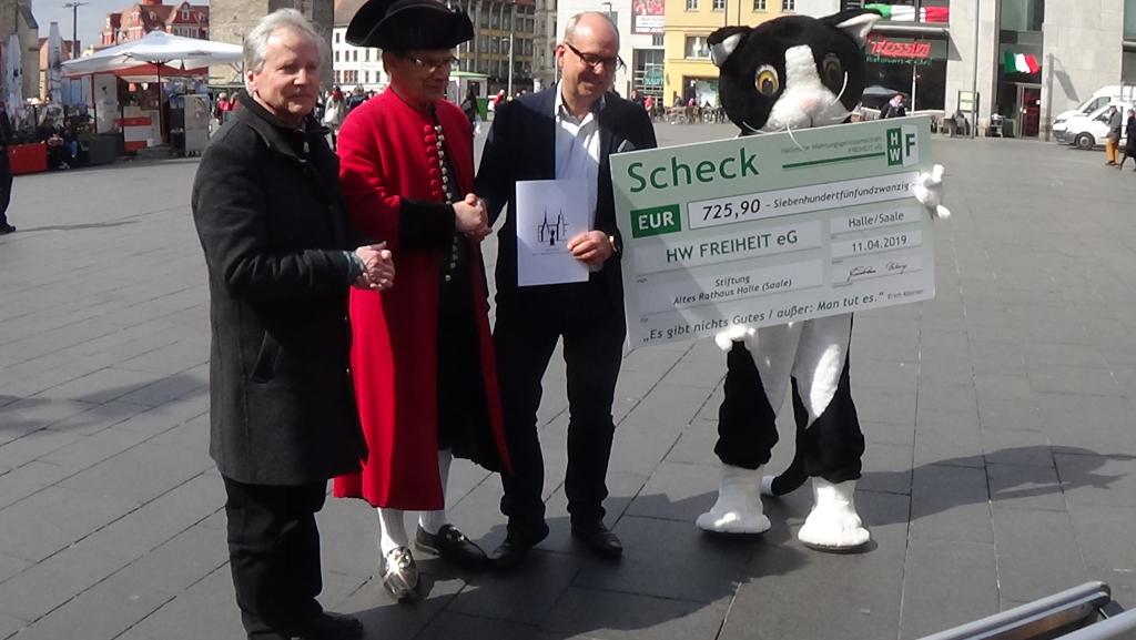 Foto: Übergabe des Stifterbriefes an den Vorstand der Wohnungsgenossenschaft FREIHEIT eG durch ein Mitglied der Salzwirkerbrüderschaft am heutigen Tag. Diese Wohnungsgenossenschaft hatte die Nachbildung des Portalsteins Nr. 46 finanziert. Siehe hierzu auch TV Halle und die Online-Ausgabe der Mitteldeutschen Zeitung am 12.4.2019