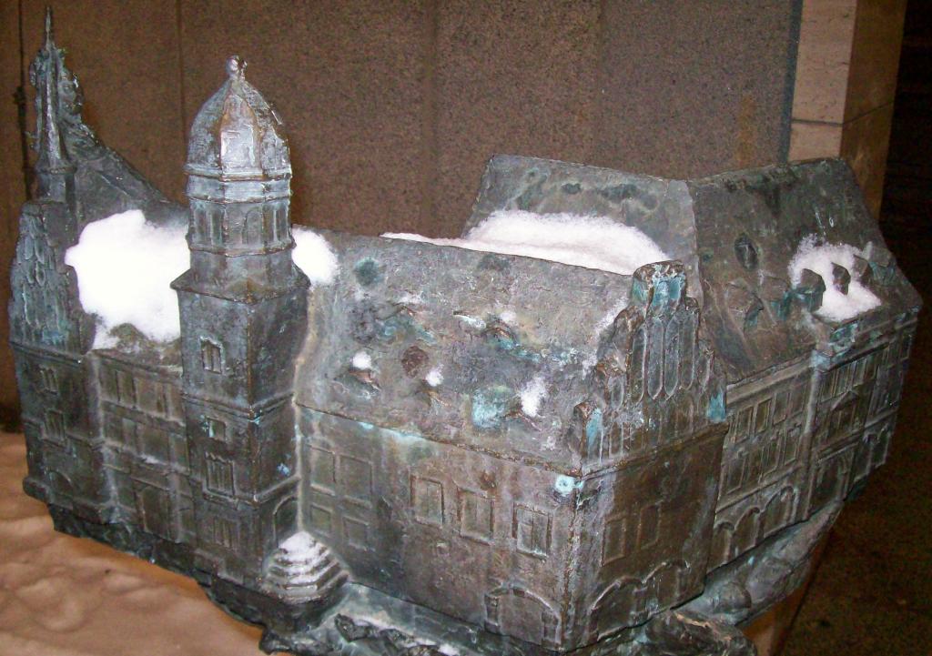 Foto: Bronzeplastik des Alten Rathauses - geschaffen von Cathleen Meier - vor dem Ratshof an einem Winterabend
