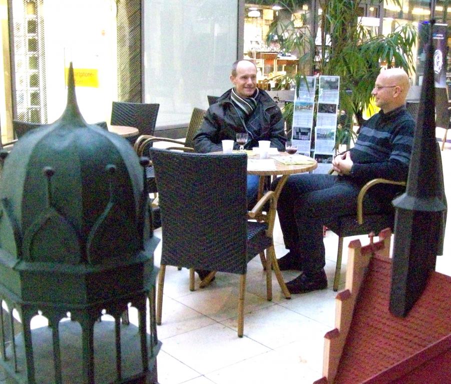 Abbildung: Verkostung der Weine "Altes Rathaus" aus dem Weingut Marcel Schulze in der "Rolltreppe" 2012. Im Vordergrund die Turmspitze des Rathaus-Modells.