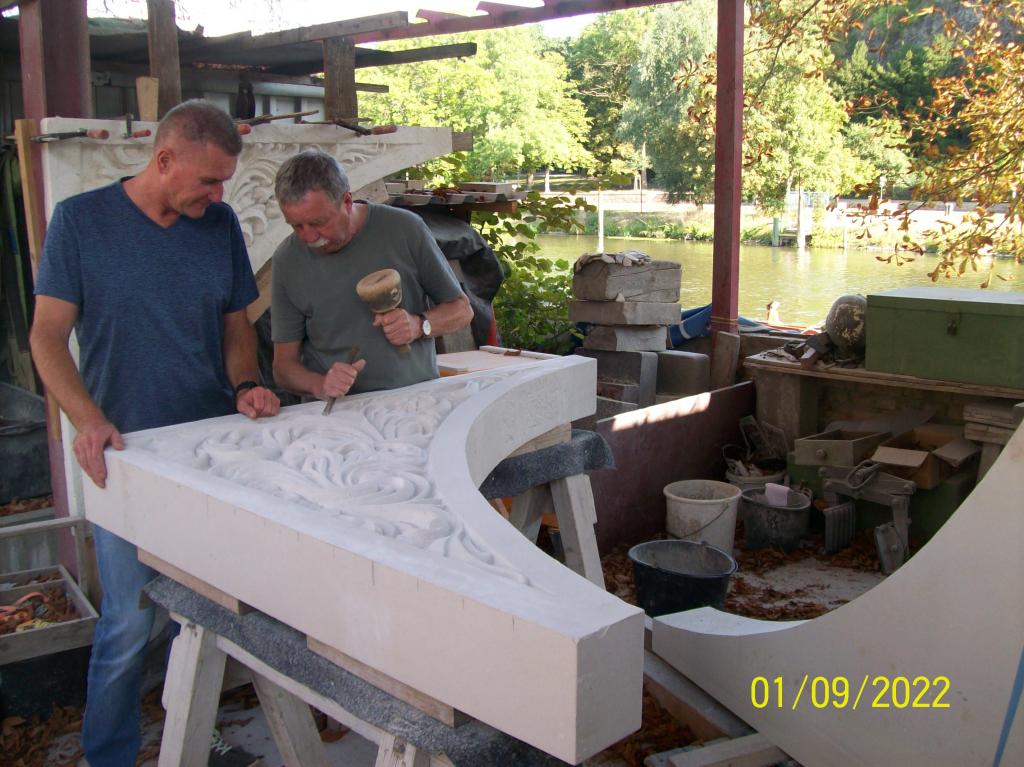 Heute übergab Bidhauer Christoph Reichenbach (rechts im Bild) den vollendeten linken Zwickel (Portalstein Nr. 62) an die Stiftung Altes Rathaus Halle (Saale) und den Stifter, Herrn Michael Wichmann, Geschäftsführer der Bohrgesellschaft Landsberg mbH. Hinter den Genannten ist das Gipsmodell des linken Zwickels und rechts unten der Rohling für den rechten Zwickel zu sehen.