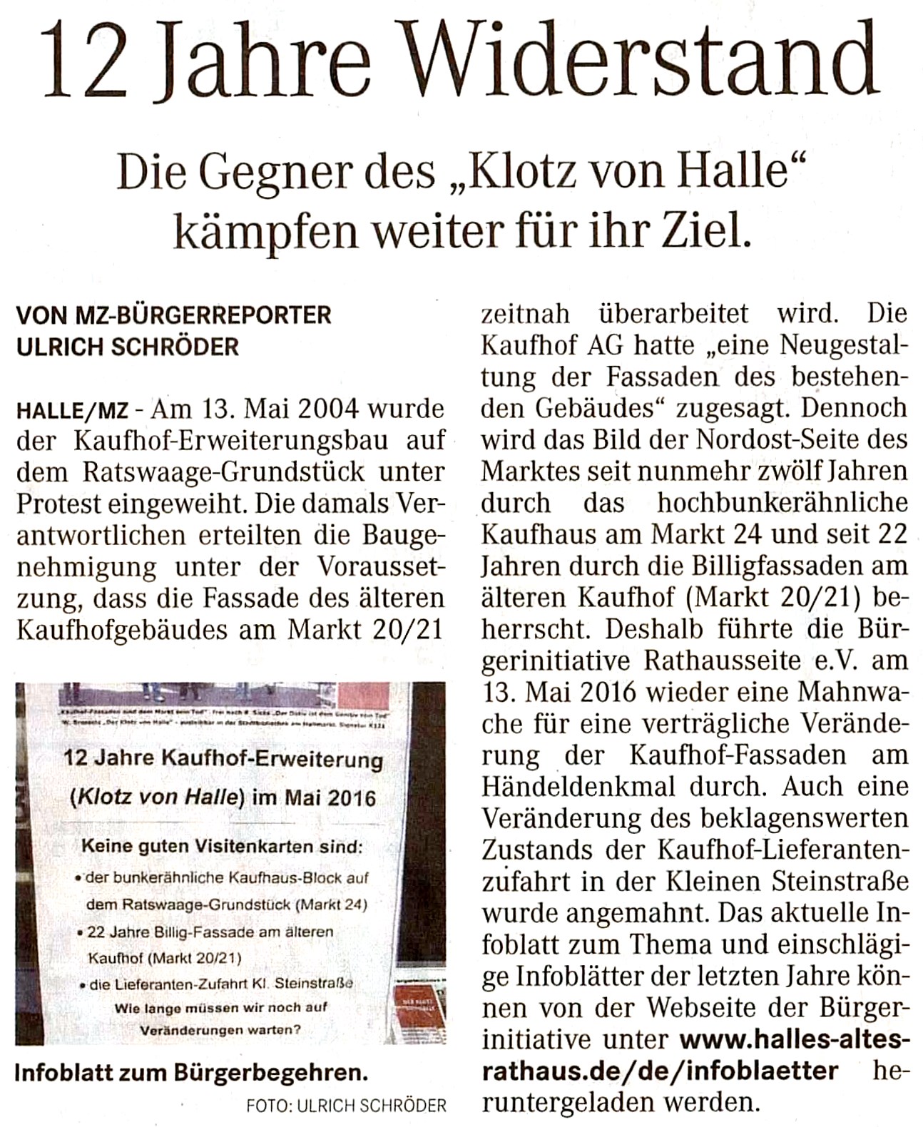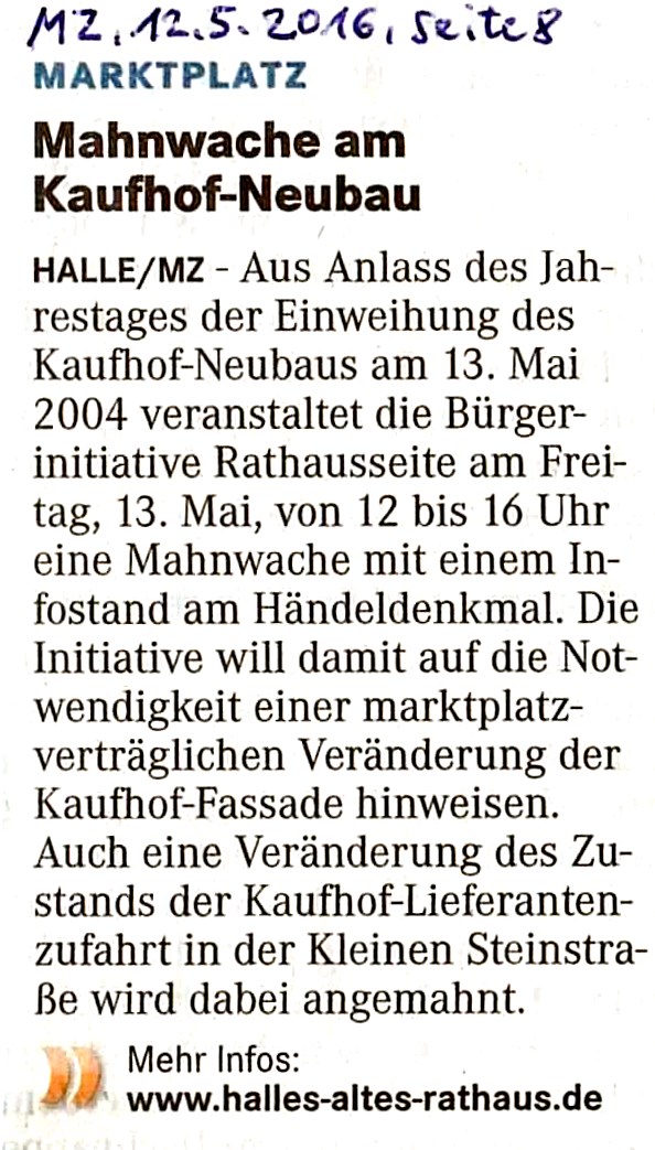 Der 12. Jahrestag der Eröffnung der Kaufhof-Erweiterung und nunmehr 22 Jahre Billigfassade am älteren Kaufhof waren Anlass, erneut Veränderungsbedarf anzumahnen: Mahnwache am Kaufhof-Neubau. Mitteldeutsche Zeitung, 12. Mai 2016, Seite 8 Die Gegner des 'Klotz von Halle' kämpfen weiter für ihr Ziel. Mitteldeutsche Zeitung, 23. Mai 2016, Seite 11