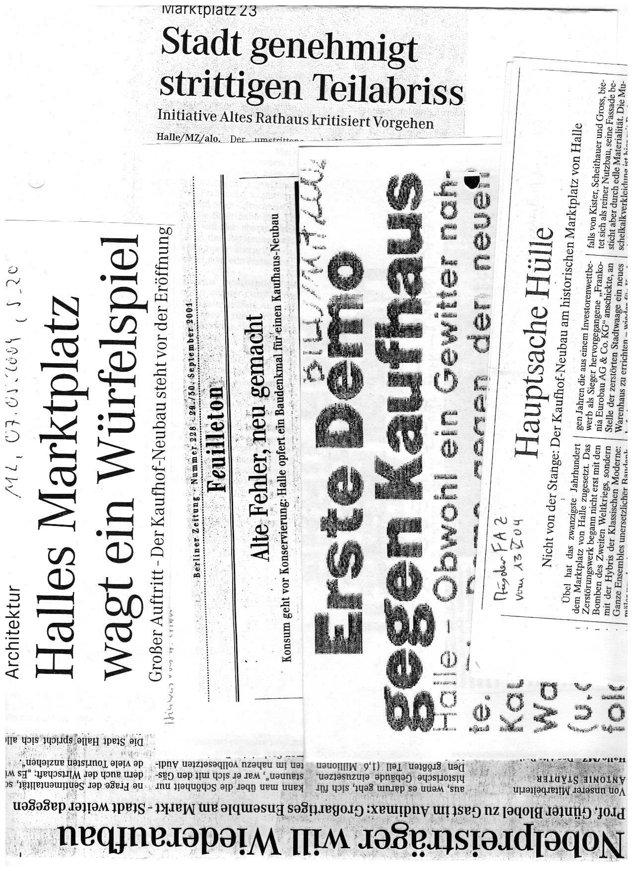Die Collage zeigt inzwischen historische Schlagzeilen regionaler und überregionaler Zeitungen zu den Kaufhausneubauten auf der Ostseite des halleschen Marktplatzes (Rathausseite). Die Überschriften veranschaulichen die Problematik der damaligen Neubebauung. Viele andere Städte hüteten bedeutsame erhaltene Bauten im Stadtzentrum und wussten diese für die Verbesserung der Lebensqualität und für die Tourismusförderung zu nutzen.