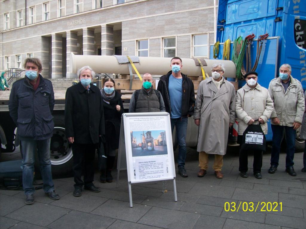 Foto (BI): Heute wurde die in Dresden nachgebildete Sandsteinsäule des Barockflügel-Portals nach Halle transportiert. Bei einem Zwischenstop am Marktplatz konnten Vereinsmitglieder das gewichtige Stück in Augenschein nehmen.