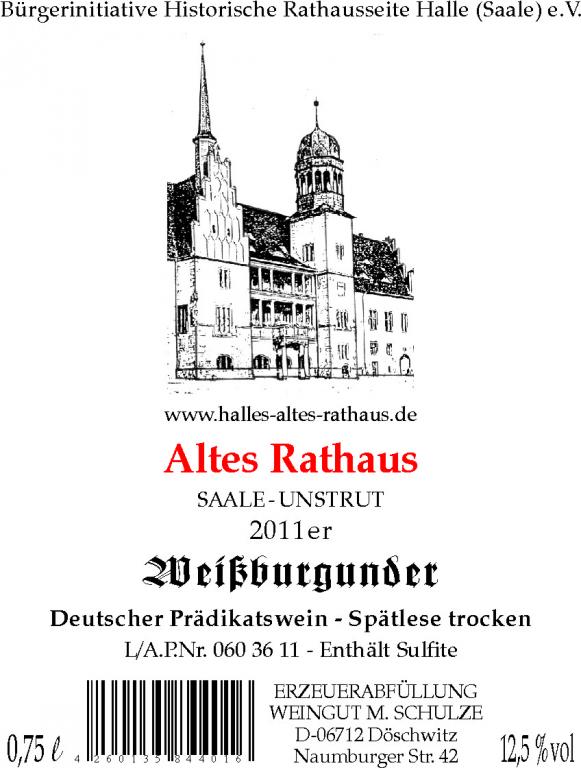 Der Saale-Unstrut-Wein "Altes Rathaus" ist in der Tourist-Information am Marktplatz nun auch als 2011er Weißburgunder erhältlich, ebenso Blauer Zweigelt. Im Wirtshaus "Alt Halle" werden Blauer Zweigelt und Kerner ausgeschenkt - alle aus dem Weingut M. Schulze.