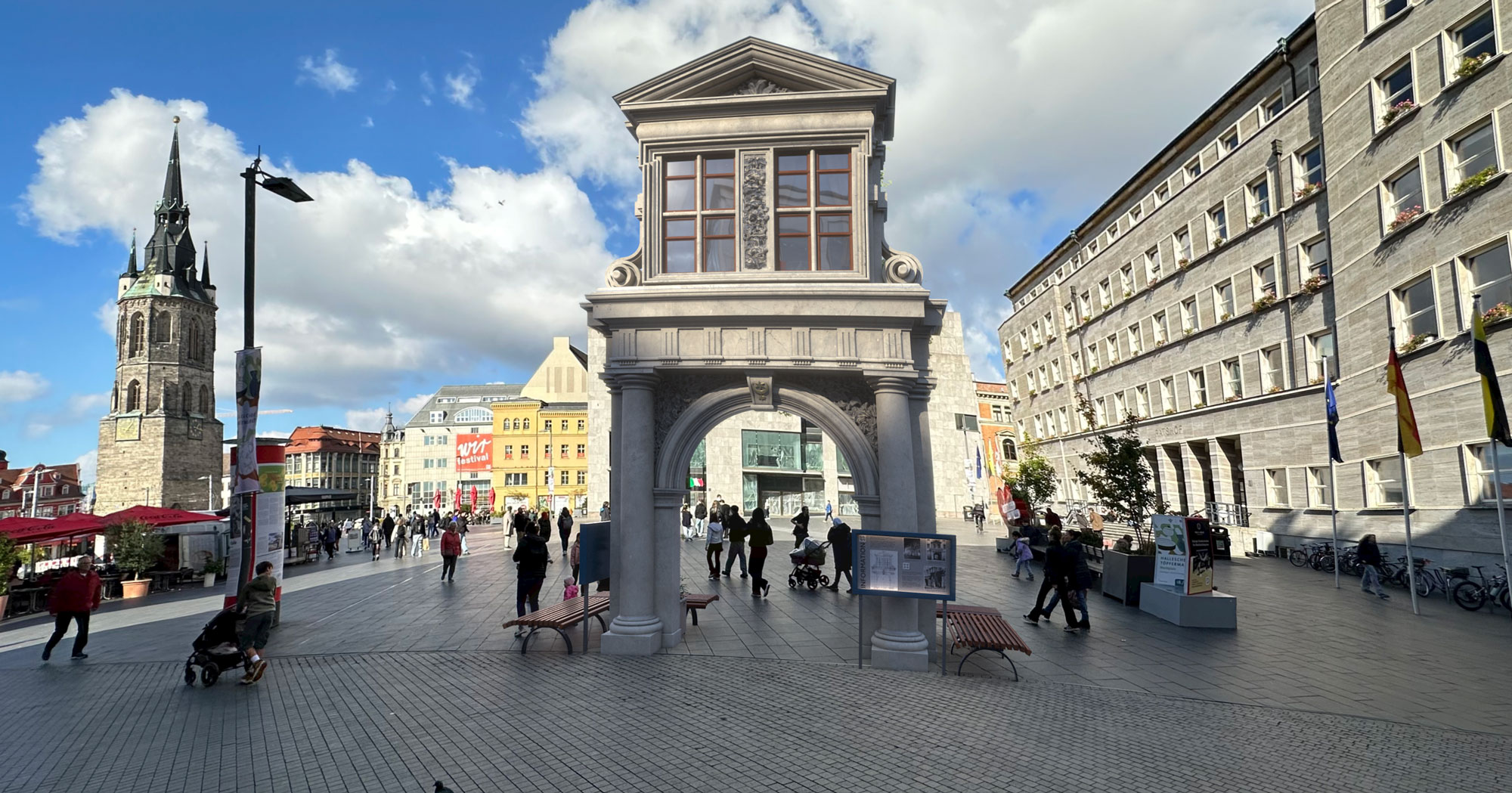 Zum Abschluss der Serie von Visualisierungen des 9,88 m hohen, 4,85 m breiten und mind. 1,32 m tiefen Barockflügel-Portals aus verschiedenen Perspektiven zeigen wir nochmals die Vorderseite von Süden (Kaufhaus New Yorker), heute jedoch am Tag. Beim Anklicken des Bildes ist dieses Mal der Rote Turm zu sehen .