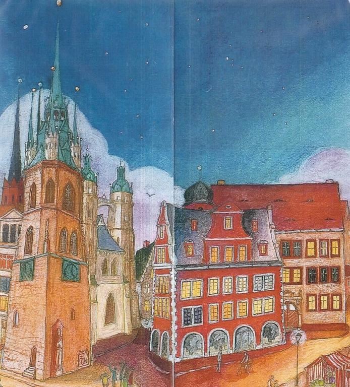 Foto: 2 Seiten des vierseitigen Lichtobjekts mit Rotem Turm, Marktkirche und Marktschlößchen; die anderen Seiten sind in der Nachricht vom 21.8.2014 zu sehen.