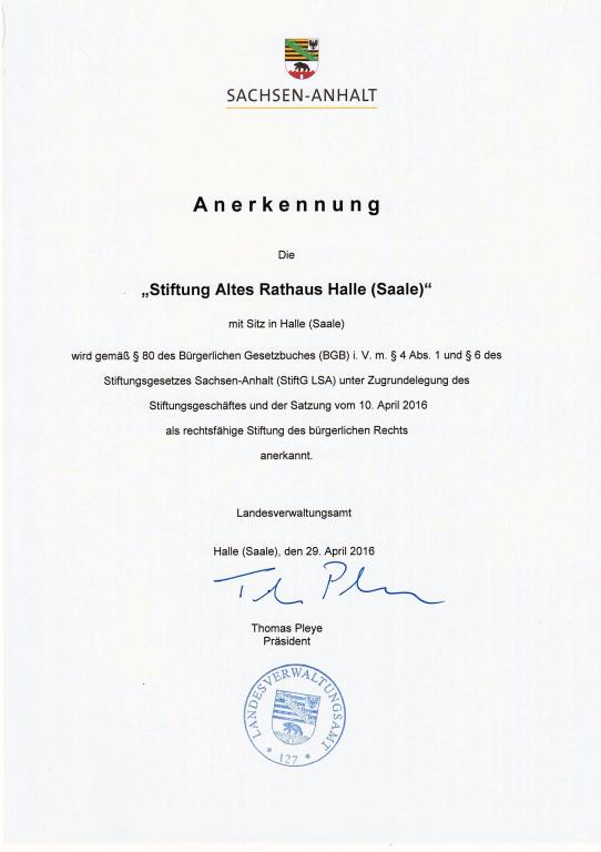 Abbildung: Urkunde des Landesverwaltungsamtes (LSA) über die Anerkennung der Stiftung Altes Rathaus Halle (Saale) als rechtsfähige Stiftung des bürgerlichen Rechts