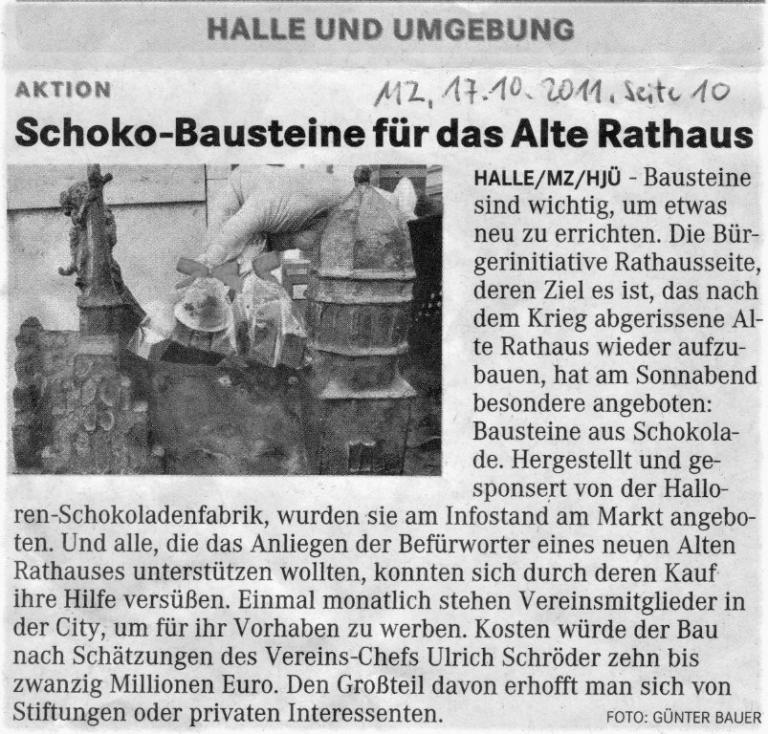 AKTION Schoko-Bausteine für das Alte Rathaus Halloren Schokoladenfabrik unterstützt erneut die BI Rathausseite e.V. Mitteldeutsche Zeitung, 17. Oktober 2011, Seite 10