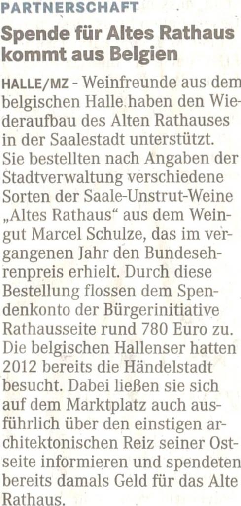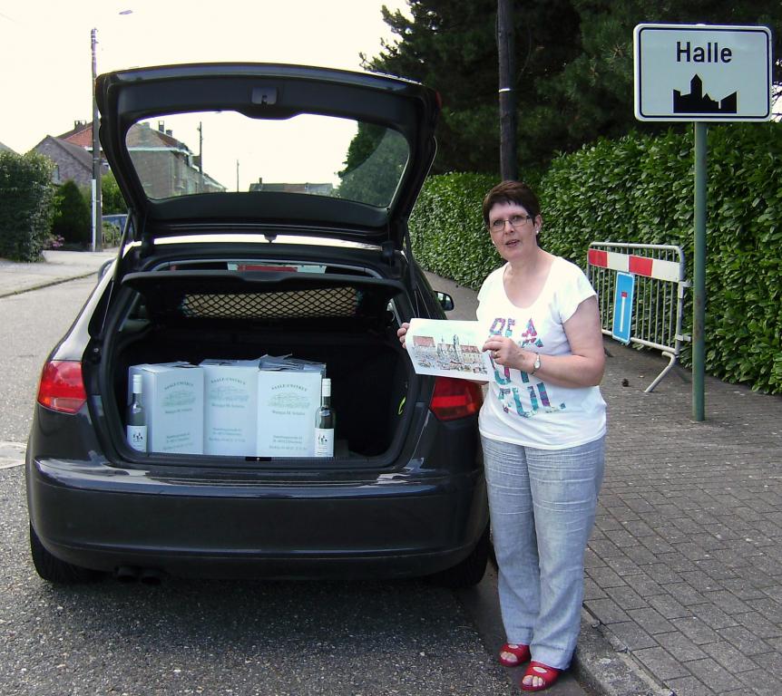 Bürger aus dem belgischen Halle unterstützen Spendensammlung. Bei einem Besuch in Halle (Saale) interessierten sich die Touristen für unser Altes Rathaus und erwarben viele Flaschen Saale-Unstrut-Weine "Altes Rathaus" als willkommenes Mitbringsel. Das Foto zeigt die Rückkehr in ihren Heimatort Halle (bei Brüssel) - im Auto die edlen Tropfen.