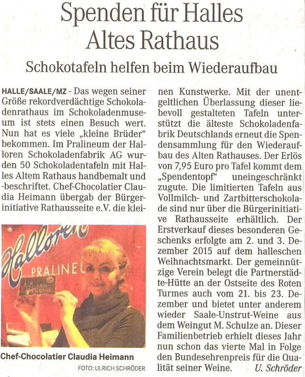 Schokotafeln helfen beim Wiederaufbau Mitteldeutsche Zeitung, 7. Dezember 2015, Seite 12 Das Pralineum der Halloren Schokoladenfabrik AG unterstützt mit der Kunstfertigkeit ihrer Mitarbeiter erneut die Spendensammlung der Bürgerinitiative Rathausseite e.V. (Wer das Schokoladenmuseum besucht, um das rekordverdächtige Schokoladen-Rathaus zu bewundern, kann auch dort das Vereinsziel finanziell unterstützen.)