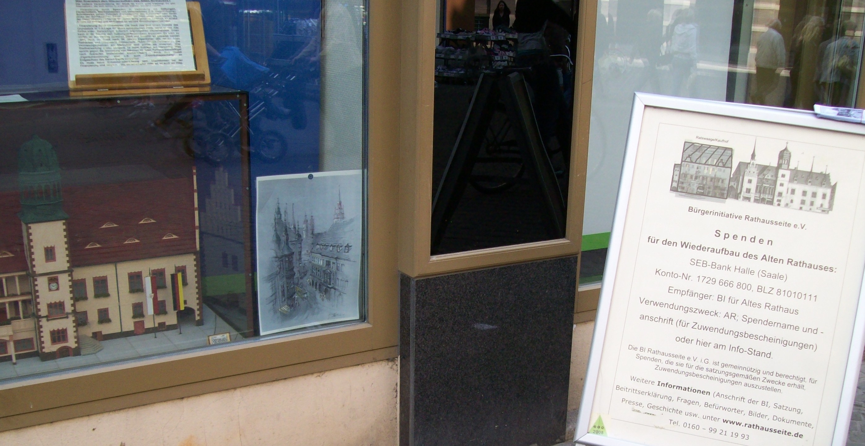 Ein Vorstandsmitglied der BI Rathausseite e.V. i.G. beantwortet am Sonnabend, dem 26. April 2008, von 15-17 Uhr Fragen zur kürzlichen Vereinsgründung und zu Mitwirkungsmöglichkeiten. Das neue BI-Infoblatt (Ausgabe 2008-04) steht unentgeltlich zur Verfügung. Standort: SEB-Bank Halle, Leipziger Str. 102 - Foto: Aufsteller vor der SEB-Filiale