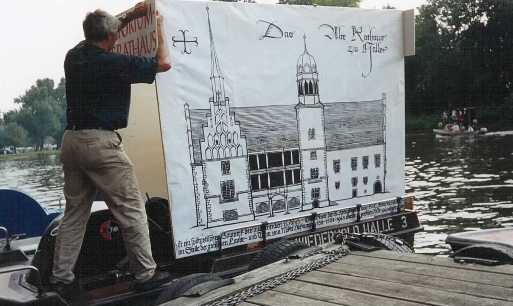 Abbildung: Werbung für Halles Altes Rathaus beim Laternenfest bzw. Bootskorso 2001 durch das KAR e.V. (Foto: BI-Archiv)