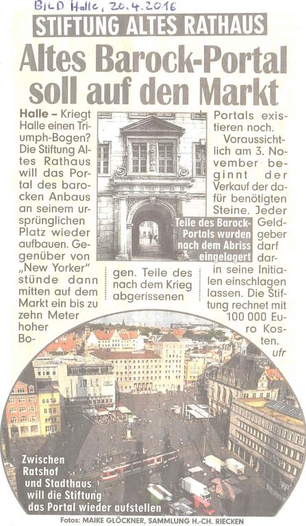 - BILD Halle, 20. April 2016: Stiftung Altes Rathaus - Altes Barock-Portal soll auf den Markt (siehe Abbildung).