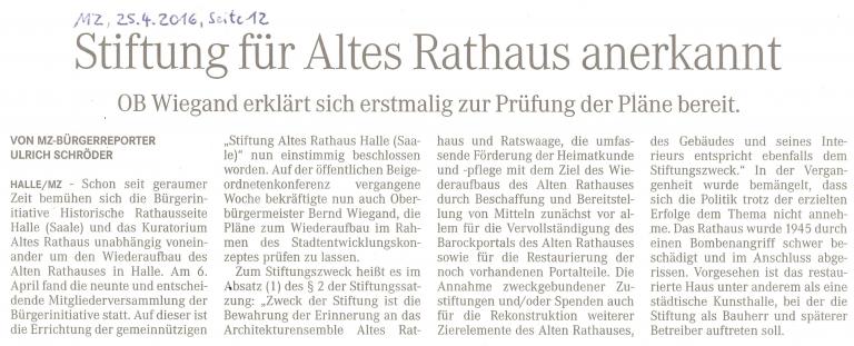 - Mitteldeutsche Zeitung, 25.4.2016, Seite 12: Stiftung Altes Rathaus anerkannt