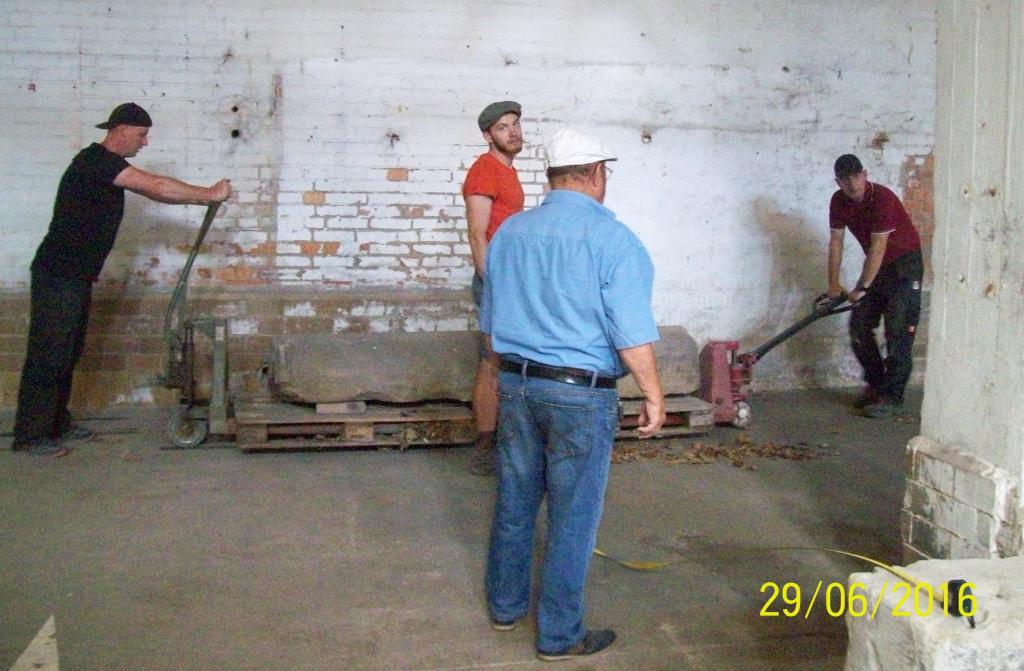 Foto: Transport eines Schaftes des Barockflügel-Portals in sein wetterfestes Quartier.