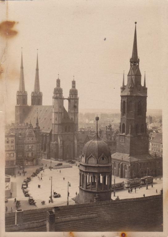 Das Foto zeigt einen Blick über das Dach des Alten Rathauses auf den Roten Turm und die Marktkirche. Es entstand vermutlich 1929. Quelle: Sammlung J. Hauke