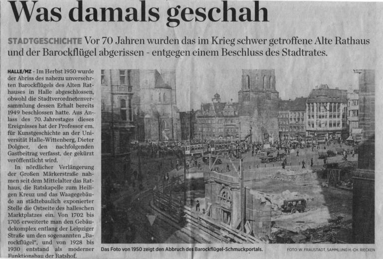Die Mitteldeutsche Zeitung veröffentlichte in ihrer analogen Ausgabe vom 28.9.2020 einen Gastbeitrag zum Abriss des nahezu unversehrten Barockflügels des Alten Rathauses entgegen einem Beschluss der damaligen Stadtverordnetenversammlung (siehe Foto, Auszug). Autor ist Dr. Dieter Dolgner, emeritierter Professor der Kunstgeschichte an der Universität Halle-Wittenberg. Anlass ist der Abschluss des Abrisses im Herbst vor 70 Jahren.