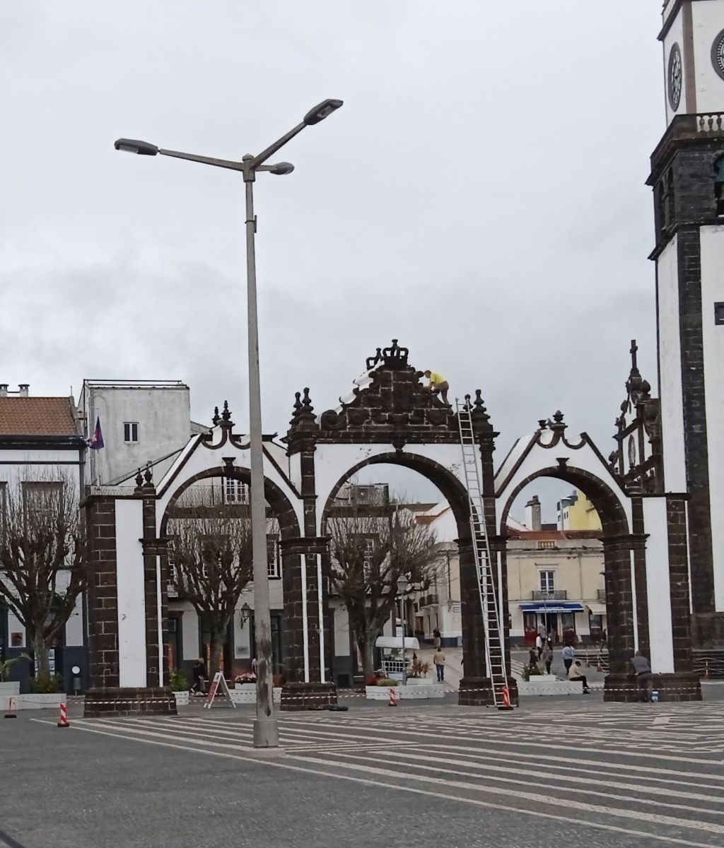 Abbildung: Freistehendes Schmuckportal in Ponta Delgada auf der Azoren-Insel Sao Miguel (Foto: privat). Es erregt Aufmerksamkeit, ziert die kleine Stadt und verlockt zum Fotografieren; wer möchte es missen? So würde es wohl auch mit dem rekonstruierten Barockflügel-Portal des Alten Rathauses werden.