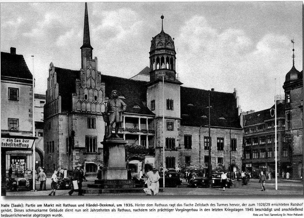 Abbildung: Partie am Markt mit Altem Rathaus und Händel-Denkmal ,um 1945 (Foto und Text: Sammlung Dr. Peter Pollandt)