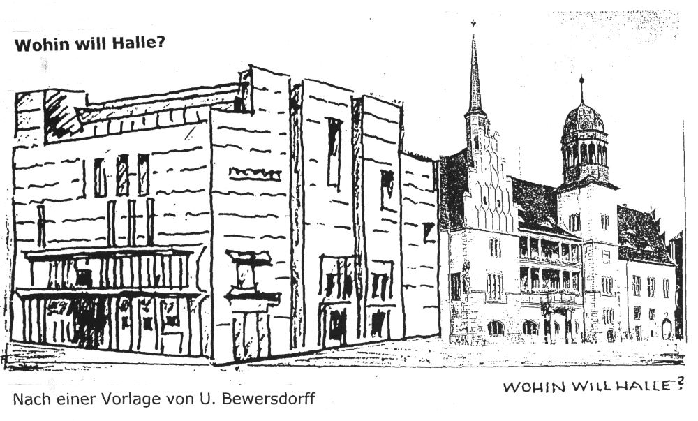 "Wohin will Halle?" (auf dem Denkmalbereich Hallescher Markt) fragte schon vor vielen Jahren unser langjähriger Universitätszeichenlehrer Ullrich Bewersdorff (1920 - 2008) mit seiner auf dem Infoblatt 2025-05 abgebildeten Zeichnung. Die Frage ist immer noch aktuell. Deshalb wird seine Zeichnung, die schon im Oktober 2004 im ersten Infoblatt der Bürgerinitiative Markt-Nordostecke Halle (Saale) - Vorgängerin der BI Rathausseite e.V. - publiziert wurde, hier nochmals veröffentlicht.