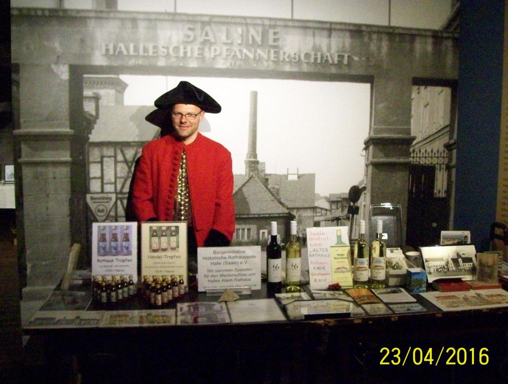 Foto: Unser Infostand mit einem Halloren zur Museumsnacht 2016 im Salinemuseum